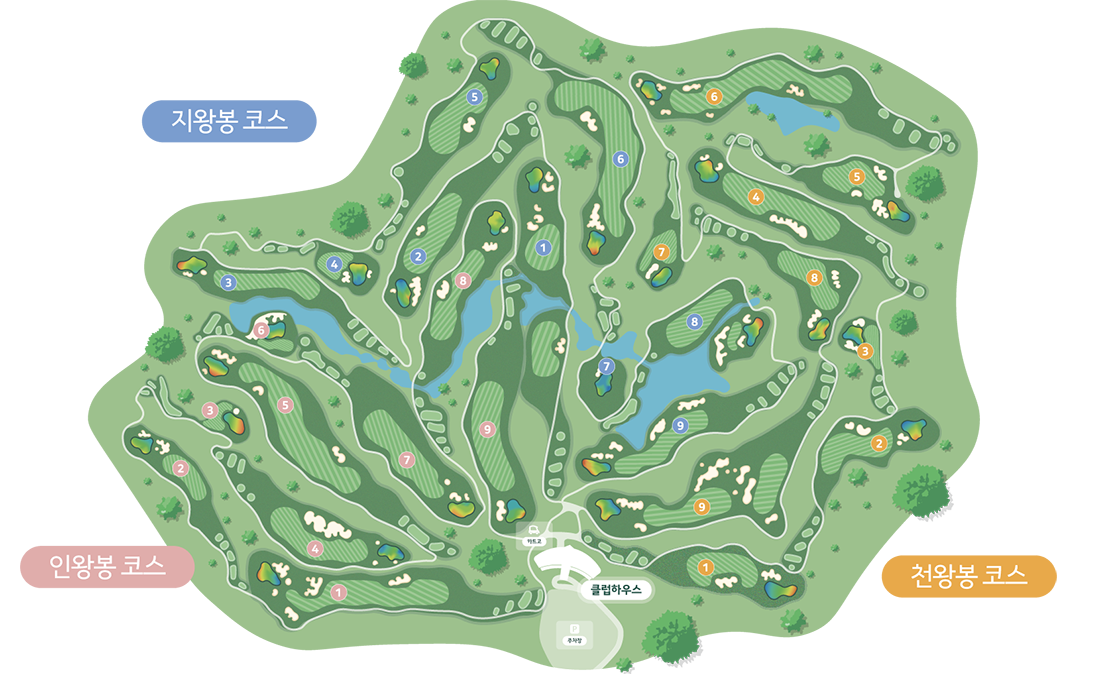 지왕봉코스 무등산 정상 삼봉 중 땅을 상징하는 지왕봉의 이름을 딴 코스로서 10번 부터 18번까지의 홀이 각각 토(土), 수(水), 초(草), 목(木), 화(花), 석(石), 금(金), 보(寶), 풍(豊)의 별칭을 가지고 있습니다. 이는 "땅의 흙(土)과 물(水)로서 온갖 풀(草)과 나무(木)와 꽃(花)을 키우고 돌(石)은 금(金)과 온갖 보물(寶)을 내어 인간을 풍요(豊)롭게 한다 "라는 의미로 사람을 풍요롭게 하는 땅의 의미를 함축하고 있습니다.